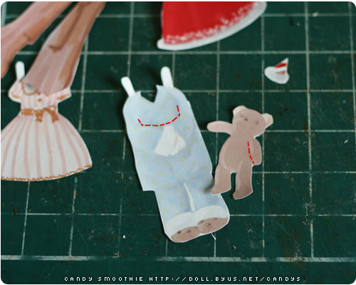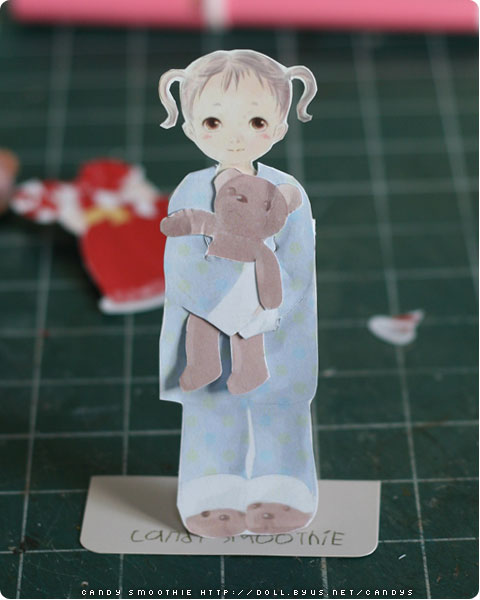 You can cut arm of blue pajama and put her Teddy bear