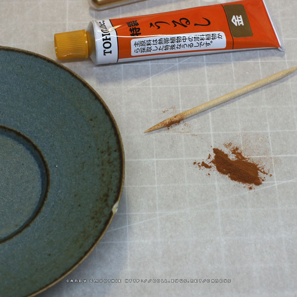 황토와 우루시를 쫀쫀하게 섞어 이 나간 부분에 발라줍니다.
