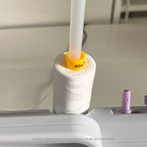 작은 실밖에 꼽히지 않는 실패에 플라스틱 튜브( = 두꺼운 빨대)를 걸어 좀 더 큰 실패를 사용할 수 있게 했습니다.